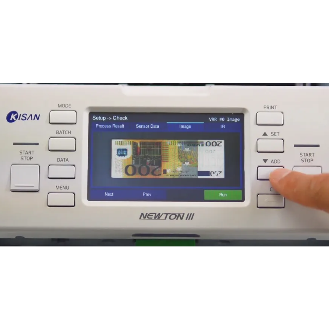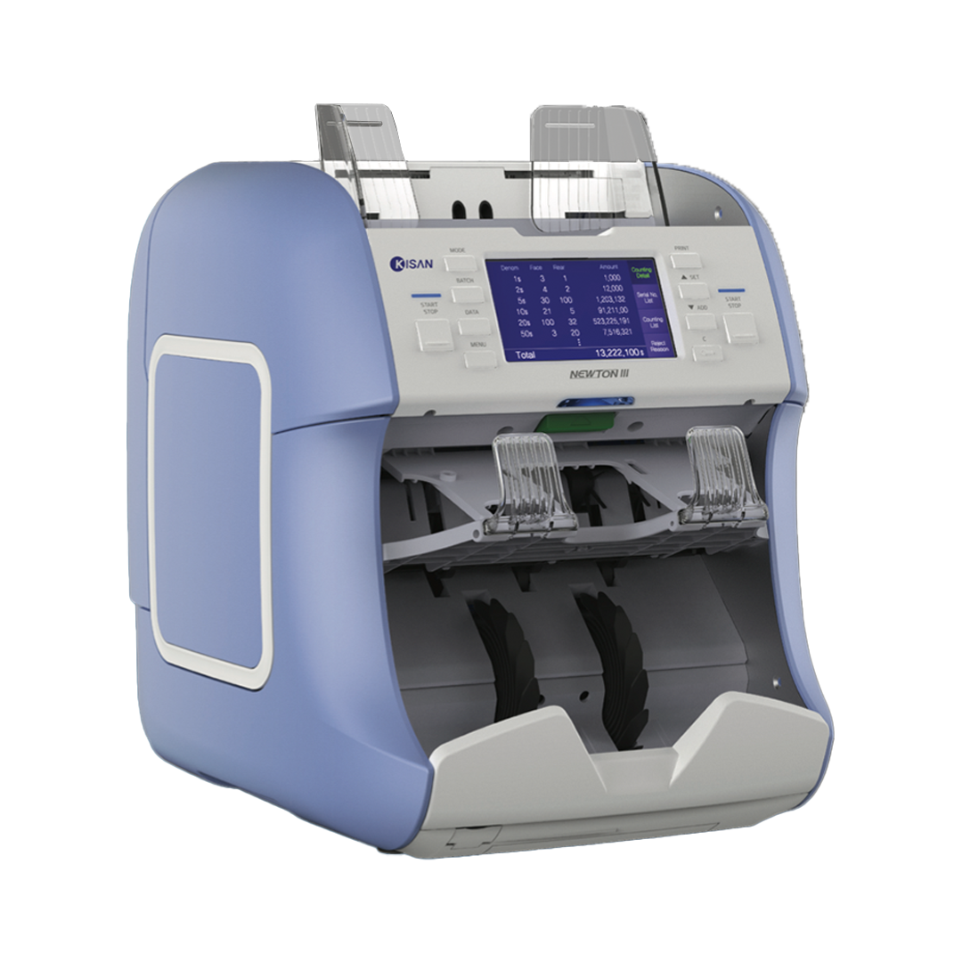La Kisan Newton III est une machine bancaire hautes performances, capable de compter et trier jusqu’à 1 500 billets/minute. Équipée de capteurs Dual CIS couleurs, elle reconnaît automatiquement les billets, les trie par valeur, par orientation ou par état physique (tri fitness), tout en détectant les faux billets avec précision.